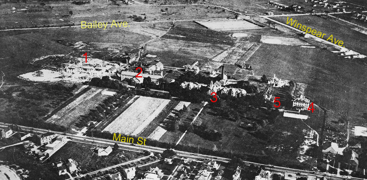 The county retained its hospital, a maternity building, and nurses' residence on land not sold to the university. UB Students and county residents were separated by wooden barricades. In the aerial photo above one can see the beginnings of the university's possession of the land. Note that the farmland between the buildings and Main Street is still under cultivation by the almshouse residents. Building (1) is Foster Hall under construction; (2) is former almhouse office building; (3) is the County Hospital which, by 1922, served elderly indigent residents; (4) the nurses' residence; (5) maternity hospital. Other buildings belonging to the county include storage, kitchens, heating plant, etc.